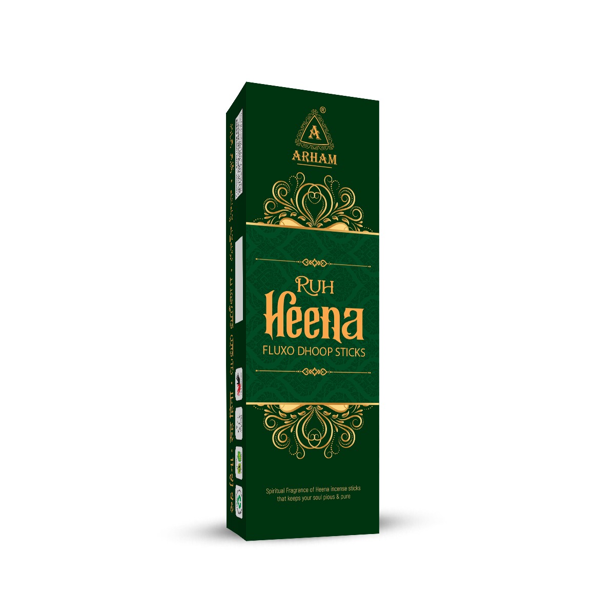 Let the calming aura of Ruh Heena Dhoop Sticks envelop your home. Reconnect with tradition. Reconnect with peace. Only from ARHAM FRAGRANCE.